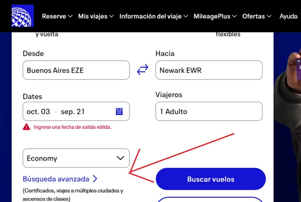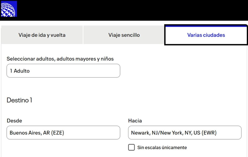 Tomamos como ejemplo la salida del 3 de octubre desde Buenos Aires con United Airlines. Y le vamos detallando el paso a paso en esta nota. En la página oficial y en búsqueda avanzada vamos a encontrar la opción multidestino.