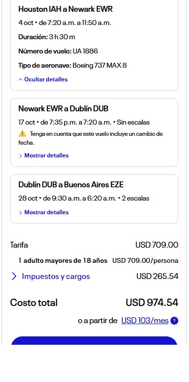 Luego en el destino 2 pusimos desde Newark (EWR) hasta Dublin, capital de la República de Irlanda para el 17 de octubre. Y en el tercer destino colocamos el tramo Dublin – Buenos Aires (Ezeiza) para el 28 de octubre. Abajo de todo aparecerá el botón azul de buscar vuelos y el resultado, de momento es magnífico.